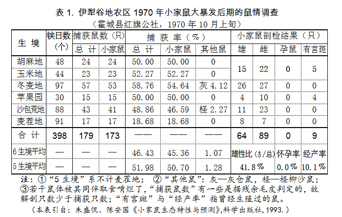 小家鼠上世紀(jì)在北疆5次大暴發(fā)之外,還有多次小暴發(fā)。表1所示“捕獲率”是鼠的相對(duì)數(shù)量指標(biāo),系采取“夾日法”調(diào)查所得。即用鐵板夾,以生倭瓜籽為餌,每個(gè)調(diào)查地塊約100個(gè)夾,循一直線走5米擺置1夾(住宅區(qū)則是每1間房置1夾),放置1晝夜(下午置、翌晨收),按實(shí)收夾數(shù)計(jì)算百夾捕獲鼠數(shù),稱“夾日捕獲率(﹪)”,可反映鼠在該片的相對(duì)密度。由于是一線向前隨機(jī)放置,不得特意尋找鼠洞、鼠跡專注捕捉,而正常情況下鼠會(huì)各自保持一片“領(lǐng)地”互相分隔開,所以平常年份每百夾只會(huì)捕到一二十只鼠。1970年10月上旬霍城5類主要生境小家鼠平均捕獲率達(dá)50.70﹪,這是“大暴發(fā)”狀況,其實(shí)此時(shí)當(dāng)?shù)匾堰^(guò)暴發(fā)頂峰并進(jìn)行了大規(guī)模群眾性滅鼠。1967年天山北麓農(nóng)區(qū)無(wú)夾日調(diào)查數(shù)據(jù),按群眾描述作比對(duì),估計(jì)其頂峰時(shí)平均捕獲率應(yīng)達(dá)60﹪以上。