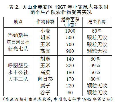 該公社保林六隊(duì)種植的200畝紅花(藥材)無(wú)一朵收獲,石河子安七農(nóng)場(chǎng)40畝綠豆只收1.5公斤。表2是中心區(qū)2個(gè)生產(chǎn)隊(duì)受鼠害實(shí)錄,真是觸目驚心!昌吉州東端的吉木薩爾縣有些社隊(duì)受害也很重,三臺(tái)公社西地大隊(duì)小麥?zhǔn)芎β蕿?0﹪,玉米、高粱則達(dá)90﹪。據(jù)自治區(qū)當(dāng)時(shí)不完全統(tǒng)計(jì),該年北疆農(nóng)區(qū)僅糧食一項(xiàng),因鼠害損失達(dá)15萬(wàn)噸(即3億市斤)。后核查天山北麓農(nóng)業(yè)區(qū)(10個(gè)縣加域內(nèi)的建設(shè)兵團(tuán)墾區(qū))實(shí)報(bào)糧食總產(chǎn)量,豐收的1966年為73.23萬(wàn)噸,1967年驟降為52.22萬(wàn)噸!此減產(chǎn)減收有多方面因素,鼠害損失無(wú)疑占大頭。
