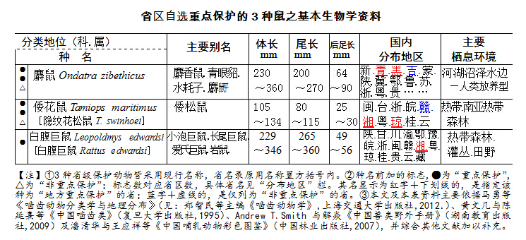 本篇講述未列在《國(guó)“三有”動(dòng)物名錄》上、系各省自行選定為“地方重點(diǎn)保護(hù)”的3種鼠,其基本生物學(xué)資料匯總于下表: