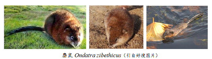 Ondatra ?zibethicus(Linnaeus,1776):別名麝香鼠、青眼貂、水耗子,英文名Common Muskrat Musquash,系倉(cāng)鼠科田鼠亞科麝鼠屬,該屬僅此1種。是田鼠亞科里體型最大者,營(yíng)水陸兩棲生活;以尾側(cè)扁和后足具半蹼2項(xiàng)特征,區(qū)別于國(guó)內(nèi)田鼠亞科其他種類(lèi)。