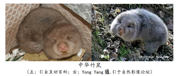 竹鼠屬Rhizomys:本屬體形較大,體長21~48厘米,尾長5~20厘米,體重1~4千克。主要分屬特征是上門齒幾乎垂直,齒端向后。其門齒寬大,橙色。下頜骨冠狀突很高。下門齒齒根伸向后方,至下頜后端并在髁狀突外側(cè)形成1極高的拱形突起。乳頭在胸部1、2對,腹部3對。中華竹鼠Rhizomys sinensis Gray,1831? ?別名普通竹鼠、灰竹鼠、竹? *、竹根鼠、竹根豬、竹貍、冬芒貍等,英文名Chinese Bamboo Rat。體肥而壯,頭圓而大,成獸體長一般小于30厘米,大者不超過38厘米,重0.4~0.9千克。吻鈍,頸短,眼小;耳殼圓短,隱于毛被內(nèi)。尾短小,幾乎全裸無毛。四肢短粗,具橄欖褐色強爪。體毛厚密柔軟,呈淡灰褐色、粉紅褐色或粉紅灰色,毛基灰色,毛尖發(fā)亮;腹面毛色略淺、較稀疏。體色隨年齡而由深變淺,幼體周身被毛皆為深灰黑色,比成體的深。
