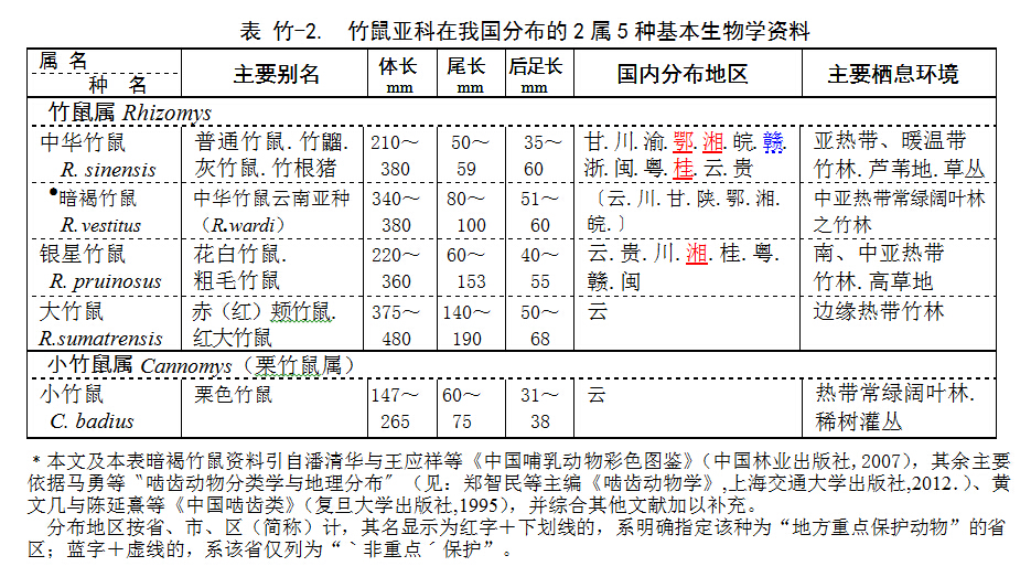 具國際影響力的Wilson and Reeder《世界哺乳動物物種》(2005)新分類系統(tǒng)中,我國分布的鼴形鼠科竹鼠亞科為2屬4種,我國汪松等《中國物種紅色名錄》(2004)、鄭智民(馬勇)等《嚙齒動物學(xué)》(2012)皆采此說,潘清華與王應(yīng)祥等(2007)則將原中華竹鼠云南亞種訂正為暗褐竹鼠Rhizomys ?vestitus,列為獨立物種。為便于讀者了解,今將該5種竹鼠的基本生物學(xué)資料一并列于表 竹-2。