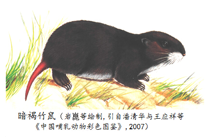 早先,《中國藥用動物志》(1983)及王應(yīng)祥(2003)將暗褐竹鼠的學(xué)名記為Rhizomys wardi Thomas,1921。潘清華與王應(yīng)祥等的《中國哺乳動物彩色圖鑒》(2007),將其拉丁學(xué)名訂正為R. vestitus Milne-Edwards,1871,稱其是中國特有種,并將其分布區(qū)改為“分布于云南(西北部)、四川、甘肅(南部)、陜西(南部)、湖北、湖南、安徽等地”,說它在云南西部地區(qū)與中華竹鼠滇西亞種R.s.pediculus重疊分布而形態(tài)各異;在安徽,則暗褐竹鼠見于長江以北地區(qū),而中華竹鼠分布在皖南。依此說,該書所附“中國哺乳動物分類名錄”里,竹鼠屬Rhizomys的物種數(shù)是4個,竹鼠亞科共5種。