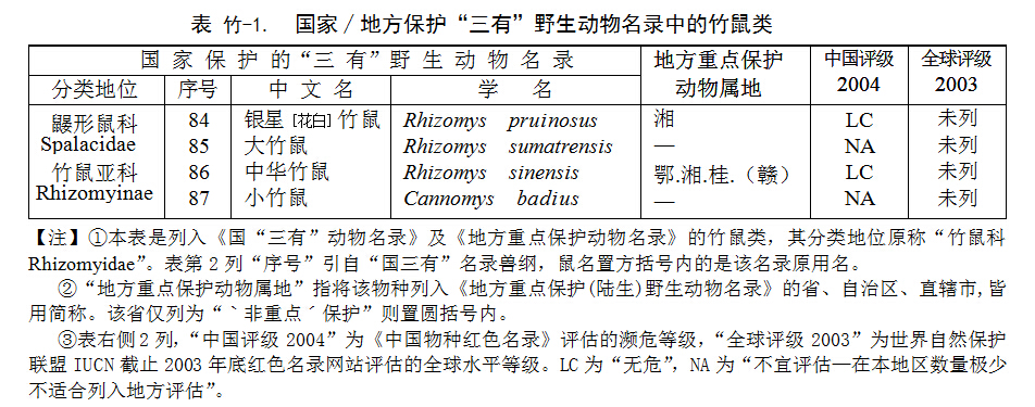 Cannomys 1種,為亞洲特有,此2屬4種在我國南部有分布,全已列入《國“三有”動物名錄》(見表竹-1)。但姜鳳梧等《中國藥用動物志》(1983)及王應(yīng)祥(2003)將中華竹鼠云南亞種列作獨立物種——暗褐竹鼠