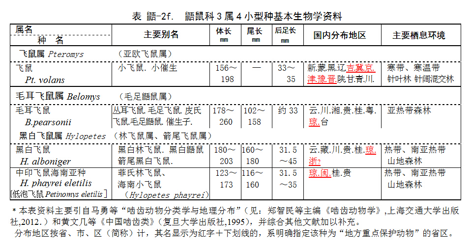 前5篇介紹了4屬14種鼯鼠,它們分別是特大型、大型與中型種,余下3屬4種“飛鼠”,都是小型種,大多數(shù)體長僅20厘米左右。其基本生物學(xué)資料列于表 鼯-2f。