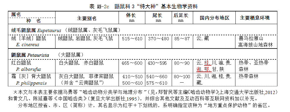 我國分布的鼯鼠科種類中,有3個種的成年體長可超50或60厘米、吻端至尾尖全身長達1米左右,可說是特大型種,現(xiàn)將其基本生物學(xué)資料列于表 鼯-2c。