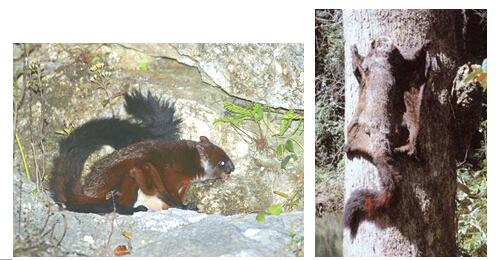 《國“三有”動物名錄》49#云南鼯鼠Petaurista? yunanensis,現(xiàn)被歸作霜背大鼯鼠的亞種。體長50~61厘米,尾長57~61厘米,耳長約47毫米。體背面從鼻到尾基部為濃厚暗栗色,毛基灰色;從尾基部至頸項,分散有許多尖端黑色而下面是一圈狹窄白色的毛,使體背面顯現(xiàn)無數(shù)的細小白色斑點。臉兩側(cè)以及眼和耳下方均呈黃灰色,雜以栗色;頦毛色暗淡;體腹面黃白色,有的在中線略帶栗色;皮翼下面邊緣亦帶有較暗的栗色;耳毛稀疏,外側(cè)前緣呈栗色,后緣黑色。皮翼前后緣、四足、踝和尾遠端約1/2呈黑色而有光澤。腳掌外側(cè)具長而密的刷狀毛。顱骨大,其寬約為長的64.5%;鼻骨后端平直,為前頜骨后端所超出;腭骨后緣中間略為向后帶出;聽泡約為顱長的22.5%。這些體型、顱骨大小和毛色等特點,皆與棕鼯鼠有明顯的差別。該亞種分布在云南西北部的維西和西南部近緬甸和老撾邊界地區(qū),緬甸和老撾可能也有分布。3個“特大種”的生存狀況