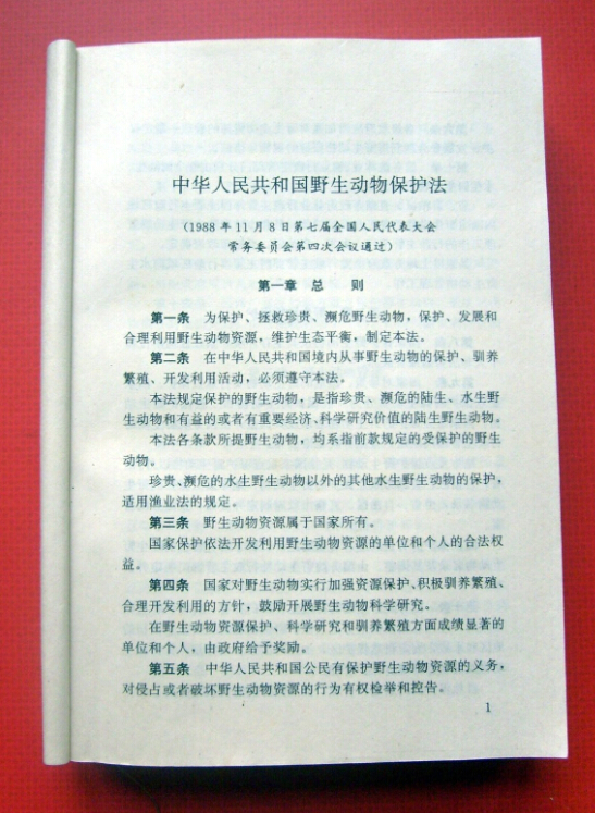 《中華人民共和國野生動物保護法》于1988年11月由全國人大常委會通過,其第一條闡明立法宗旨是“