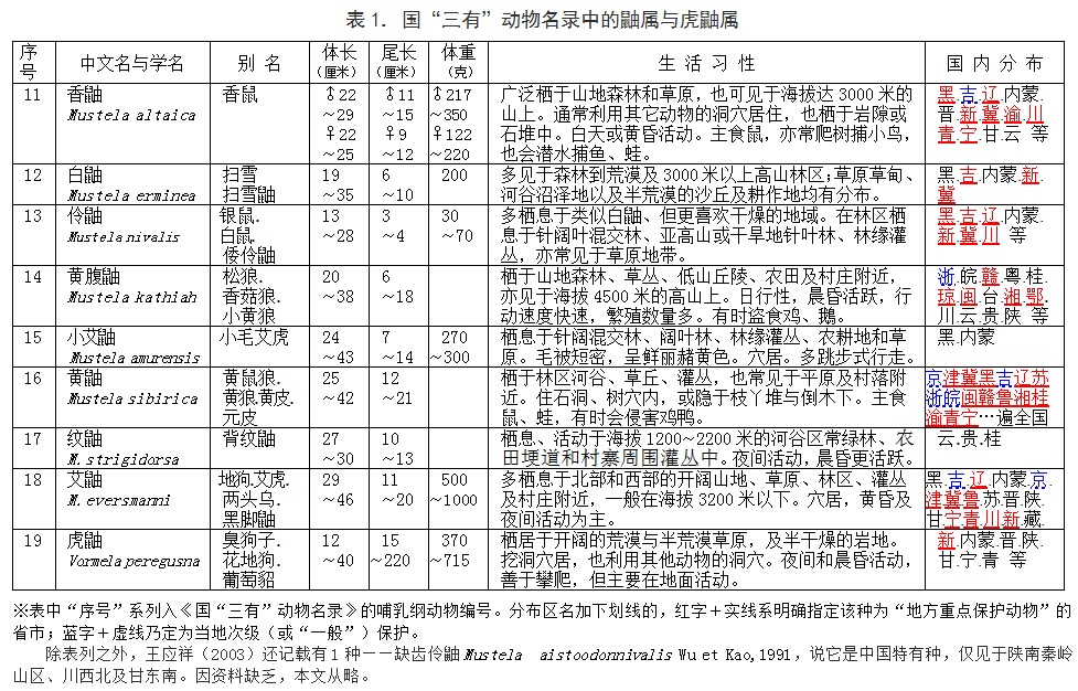 Vormela)?;Ⅶ鴮偃澜鐑H1種,我國北方各省區(qū)有分布。鼬屬全世界共17種,中國公認(rèn)有8種。2000年這9種鼬全被列入“國家保護(hù)的‘三有’動物名錄”,并有21?。ㄊ?、區(qū))先后將其中一些種指定為地方重點或次級保護(hù)動物?,F(xiàn)將它們的基本資料匯集于下表1。