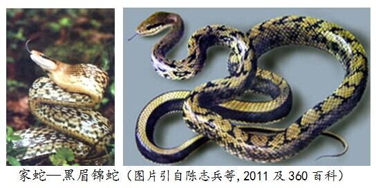 錦蛇屬的頭較長(zhǎng),與頸區(qū)分明顯;眼中等大小或略大,瞳孔圓形,眼后鱗一般為2片;體長(zhǎng)圓柱狀或略側(cè)扁;背鱗中段19~27行,平滑或起棱;尾細(xì)長(zhǎng),尾下鱗成對(duì)。上頜齒11~24枚,幾乎等大。本屬有50多種,在亞洲約30種。我國(guó)已知16種(見(jiàn)附表2),其中,充當(dāng)控制家鼠勁旅的最杰出代表是黑眉錦蛇。