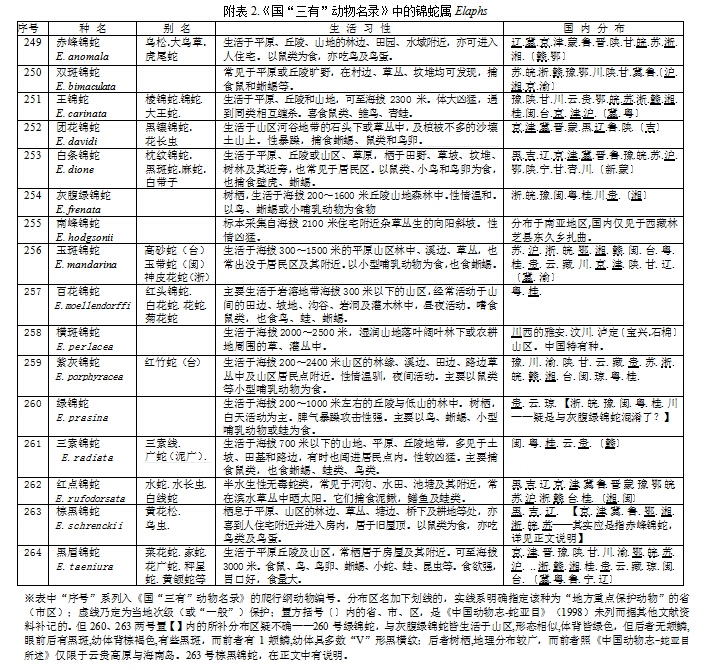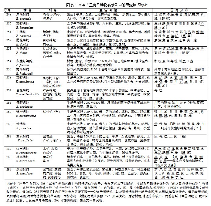 Python molurus早在1988年已被列為國(guó)家 級(jí)重點(diǎn)保護(hù)動(dòng)物之外,2000年國(guó)家林業(yè)局頒布的《國(guó)家保護(hù)的有益的或者有重要經(jīng)濟(jì)、科學(xué)研究?jī)r(jià)值的陸生野生動(dòng)物名錄》(簡(jiǎn)稱《國(guó)“三有”動(dòng)物名錄》)將國(guó)內(nèi)分布的所有蛇種幾乎全數(shù)載入——該名錄的爬行綱188﹟~395﹟共計(jì)208個(gè)號(hào),除漏列阿里山鈍頭蛇外,包含了《中國(guó)動(dòng)物志-蛇亞目》( 1998)記載的所有蛇種及一些亞種。