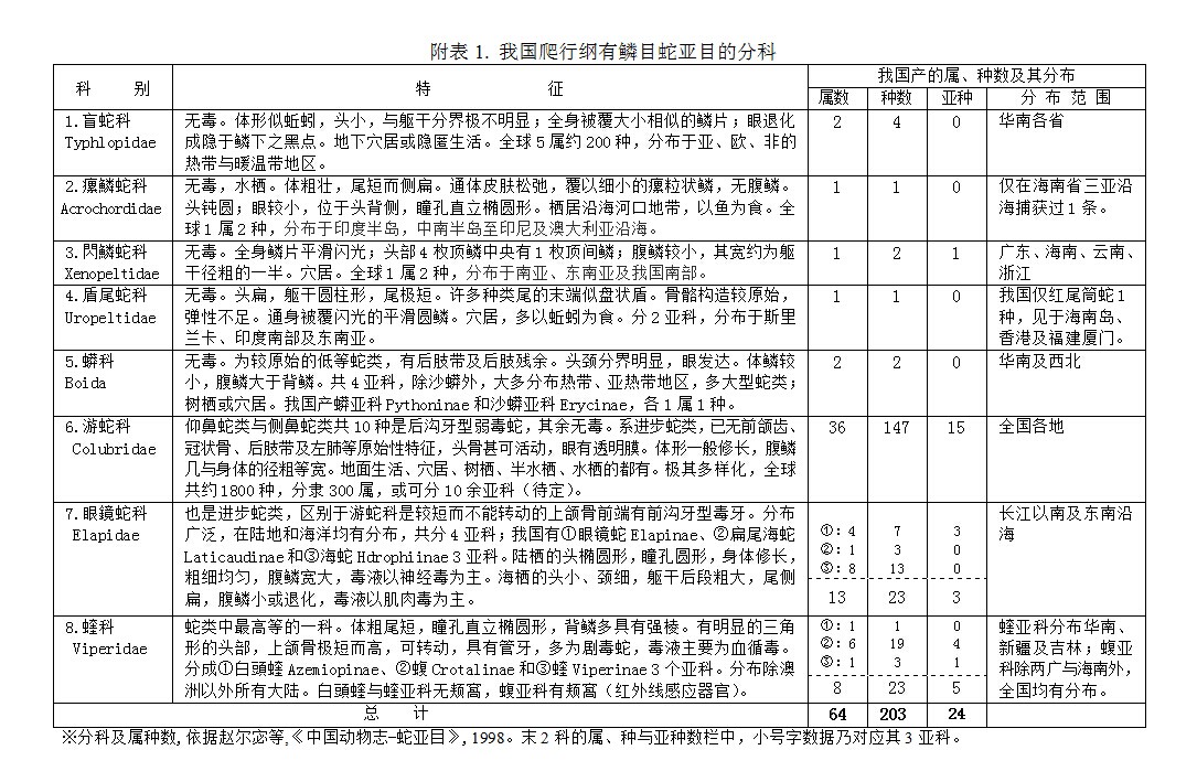 《中國(guó)動(dòng)物志-蛇亞目》記述我國(guó)蛇類(有鱗目蛇亞目)有8科、64屬、203種與24亞種(見(jiàn)附表1)。眼鏡蛇科和蝰科是劇毒蛇,共有6亞科,其中海蛇類2亞科16種生活于海水中食魚(yú),其他4亞科(眼鏡蛇、白頭蝰、蝮和蝰)共30種,多能大量捕食鼠類,但因也能毒害人,顯然在居民區(qū)不可容留。