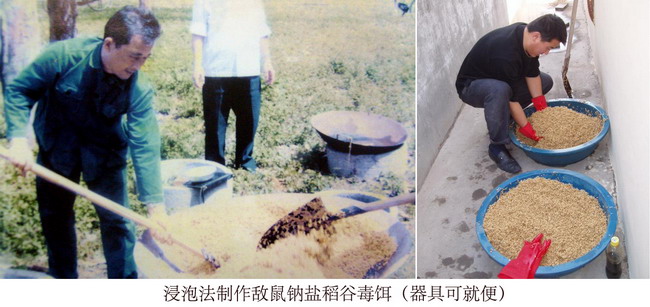簡言之,浸泡法的基本步驟有:凈谷—溶藥—浸泡+翻拌—著色。其中決定制餌質(zhì)量的關(guān)鍵,是投料準(zhǔn)確、浸泡期間勤翻拌。配制藥液的水量,視所用餌料的吸水率及當(dāng)時(shí)氣溫調(diào)整。大量制作稻谷毒餌時(shí),浸泡用水須略多(約谷重的20%),并浸泡久些(8~12小時(shí)),期間翻拌6~8次以上,使藥液能充分滲入谷內(nèi)。若是碎玉米、小麥等裸糧作餌料,用水量宜為其總重量的10%,浸泡2~3小時(shí)左右即可。習(xí)慣上毒餌濃度只按鼠藥與誘餌的比例計(jì)算,不算浸泡用的水量。