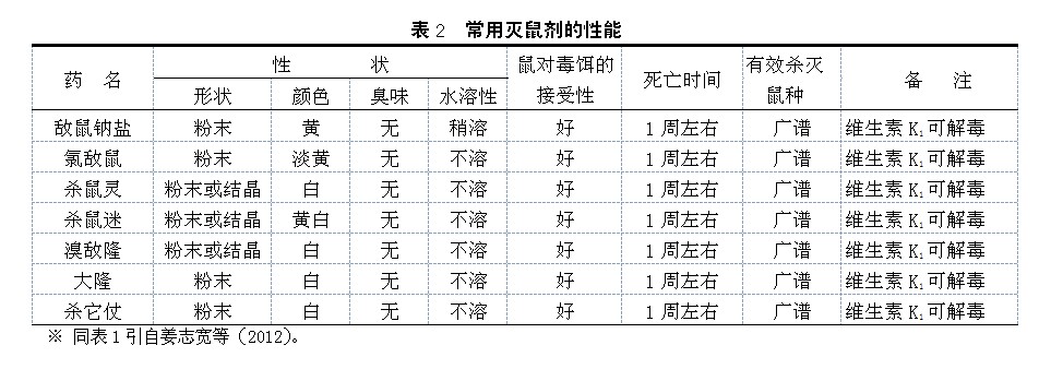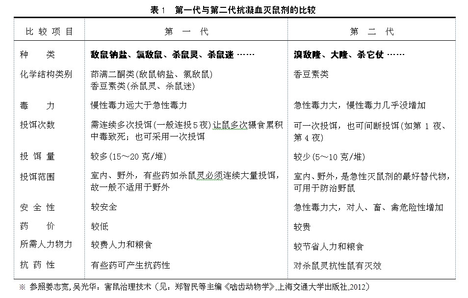第一代抗凝血滅鼠劑需多次投餌,不太適用于田野滅鼠,但安全性高,藥價便宜,住宅滅鼠宜先用它。表1列的4種藥都可,殺鼠靈是國內(nèi)使用最早的,除豬之外安全性很好;殺鼠迷的毒力強于殺鼠靈,配制的毒餌帶香蕉味,對鼠有吸引力,但對禽類不太安全;敵鼠鈉鹽對鼠的毒力(尤其急性毒力)強于殺鼠靈,但適口性不及殺鼠靈,它對雞、鴨、牛、羊的毒性較小,對貓、兔、狗較毒;氯敵鼠急性毒力強,對鼠適口性好,常用其油溶液配成毒餌。(注:敵鼠鈉鹽和氯敵鼠經(jīng)適當(dāng)配制,亦可用于田野)。