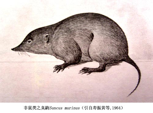 Suncus murinus,乳頭僅3對。它體長8~14厘米;體毛稠密、柔軟,通體煙灰色。吻部尖長,耳寬,眼小,肢細(xì)。尾長略超過體長之半。腰部兩側(cè)各有一臭腺,發(fā)奇臭,故俗稱“臭老鼠”。其實它是比鼠低級的鼩鼱目Soricomorpha動物,以食昆蟲及其幼蟲、蠕蟲為主,食量奇大,通常棲田野捕食大量害蟲,對農(nóng)林有益。進(jìn)人房無鼠那樣的破壞性,且性格兇猛,能食小家鼠、斗黃胸鼠;但因也會攜帶鼠疫、鉤端螺旋體病、恙蟲病和血吸蟲病等病原,為防疫在住宅宜滅之。