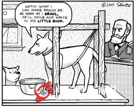 門澤爾等人的實(shí)驗(yàn)很好地發(fā)掘了蜜蜂的學(xué)習(xí)能力,動物在自然條件下的學(xué)習(xí),往往是兩種條件反射類型——經(jīng)典條件反射與操作條件反射同時發(fā)生,且以操作條件反射為主,這種學(xué)習(xí)過程就是動物行為學(xué)和心理學(xué)研究中常提到的嘗試—錯誤學(xué)習(xí)(trail and error learning)。提到條件反射,我們很自然地就會聯(lián)想到巴普洛夫(Pavlov)用狗所做的實(shí)驗(yàn)(這個聯(lián)想過程不是經(jīng)典條件反射?。?。經(jīng)典條件反射案例中包含四個要素:1、非條件刺激(Unconditioned Stimulus),如提供給狗的食物;2、非條件反射(Unconditioned Response),這一反射是動物無需學(xué)習(xí)就能自發(fā)產(chǎn)生的行為,是一種根植于實(shí)驗(yàn)對象神經(jīng)系統(tǒng)中的反射,如狗看到食物以后分泌唾液;3、條件刺激(Conditioned Stimulus),本身不能引發(fā)實(shí)驗(yàn)動物非條件反射的外界刺激,如搖鈴鐺,但是將其與非條件刺激關(guān)聯(lián)后(關(guān)聯(lián)的過程被稱為Conditioning),兩種刺激同時發(fā)生并引發(fā)實(shí)驗(yàn)體的非條件反射,如搖鈴鐺的同時提供狗糧,則狗分泌唾液,但分泌唾液的行為仍是由狗糧引起的;4、條件反射(Conditioned Response),非條件刺激與條件刺激在經(jīng)過多次的關(guān)聯(lián)配對以后,條件刺激單獨(dú)發(fā)生時也可以引起反射,如狗聽到鈴鐺聲就開始分泌唾液,這種反射雖然仍是自動的,但區(qū)別于非條件反射,是學(xué)習(xí)的結(jié)果。圖3. 巴甫洛夫?qū)嶒?yàn)的漫畫,圖中實(shí)驗(yàn)犬對另一只狗說“看我能讓巴普洛夫產(chǎn)生怎樣的條件反射——只要我一流口水,他就會微笑并低頭在他的小本子上寫字”(Comic by Mark Stivers. Image countesy of http://twistedsiffer.com)