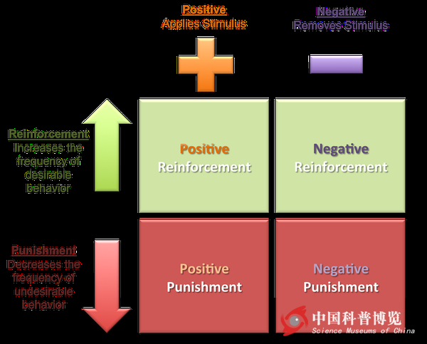 操作條件反射一般有四種情況:1、正效增強(qiáng)(Positive Reinforcement),指的是通過給予實(shí)驗(yàn)動物其所期望的刺激來增強(qiáng)某種行為出現(xiàn)的頻率,如白鼠按壓杠桿后,箱內(nèi)掉落食物,則白鼠會更頻繁地按壓杠桿;2、負(fù)效增強(qiáng)(Negative Reinforcement),指消除實(shí)驗(yàn)動物所厭惡或恐懼的刺激來增強(qiáng)某種行為出現(xiàn)的頻率,如箱內(nèi)原本通電,當(dāng)白鼠按壓杠桿后則斷電,那么白鼠會頻繁地按壓杠桿;3、正效懲罰(Positive Punishment),通過給予實(shí)驗(yàn)體不期望的刺激來減少某種行為發(fā)生的頻率,如按壓杠桿后箱內(nèi)通電,則白鼠放棄按壓行為;4、負(fù)效懲罰(Negative Punishment),撤銷實(shí)驗(yàn)體期望的刺激以減少某種行為發(fā)生的頻率,如按壓杠桿后也不向箱內(nèi)投放食物,則白鼠明顯減少按壓杠桿的次數(shù)。圖5. 操作性條件反射的四種情況(圖片來源https://wikispaces.psu.edu/display/PSYCH484/3.+Reinforvement+Theory)