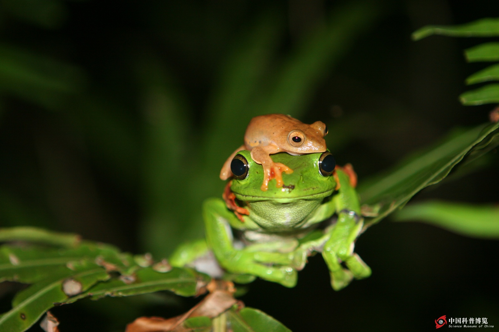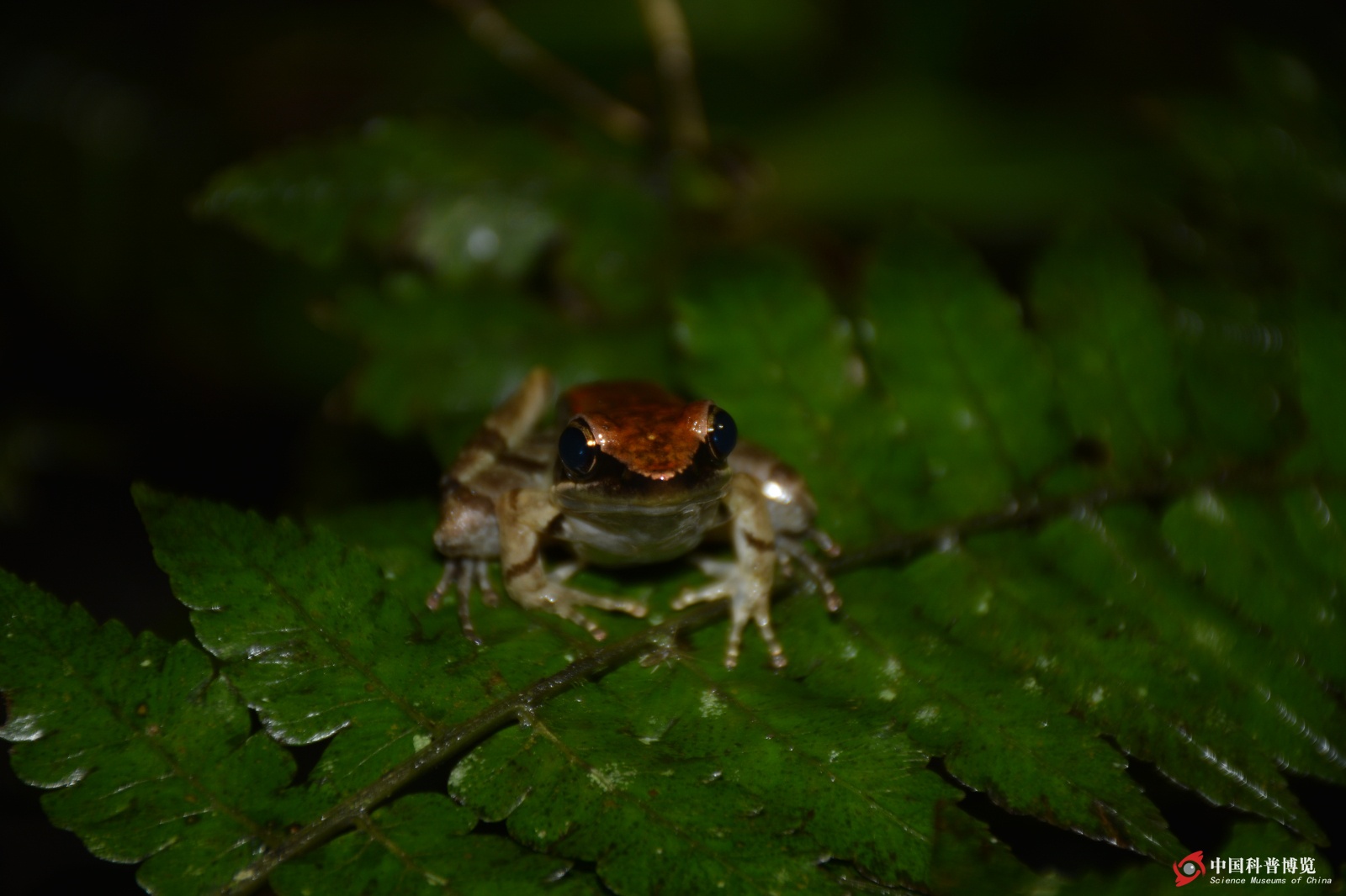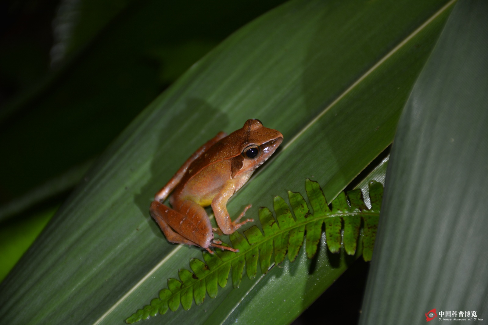 Hylarana?hainanensis趴在樹葉上,它們被稱作