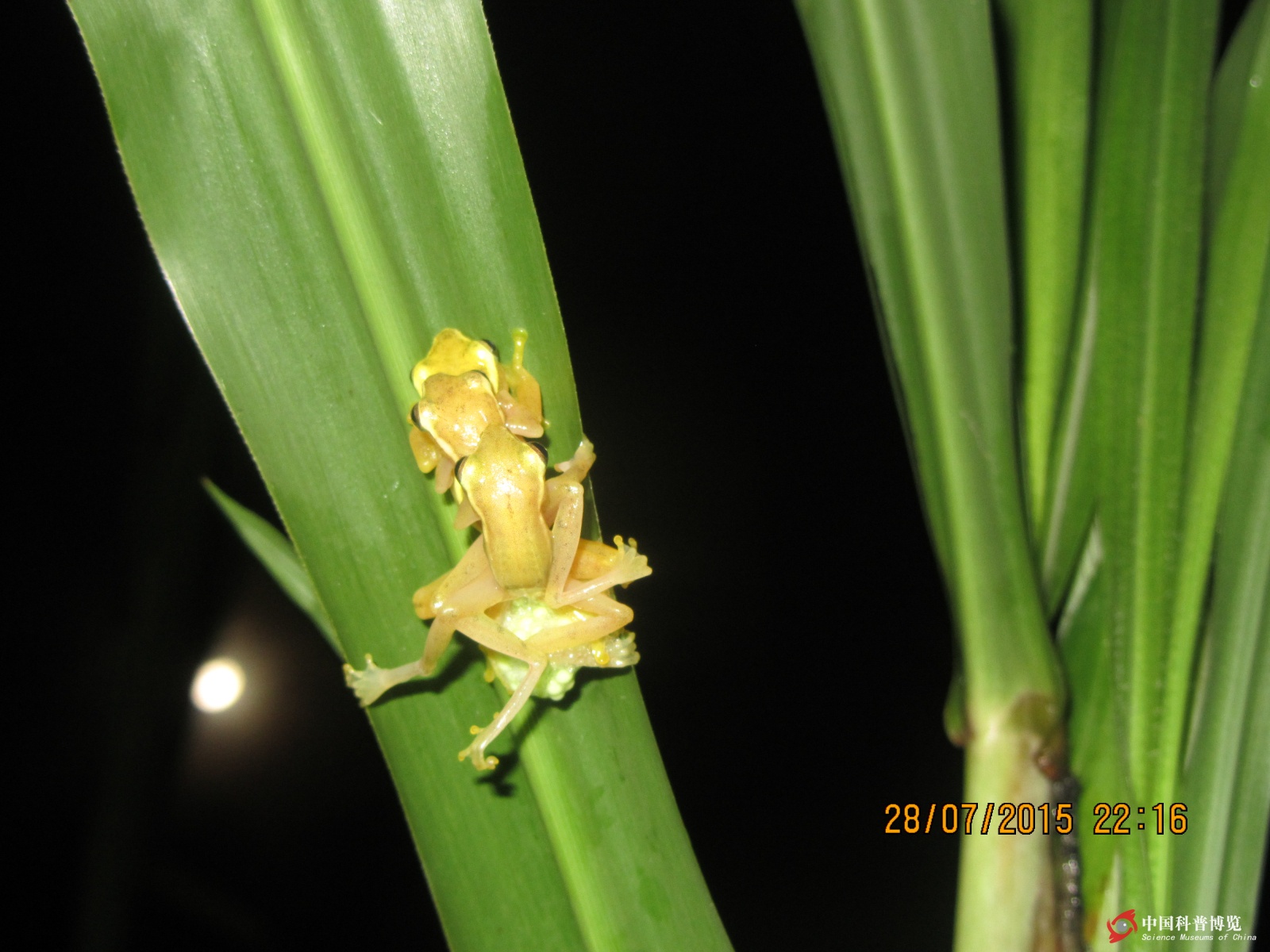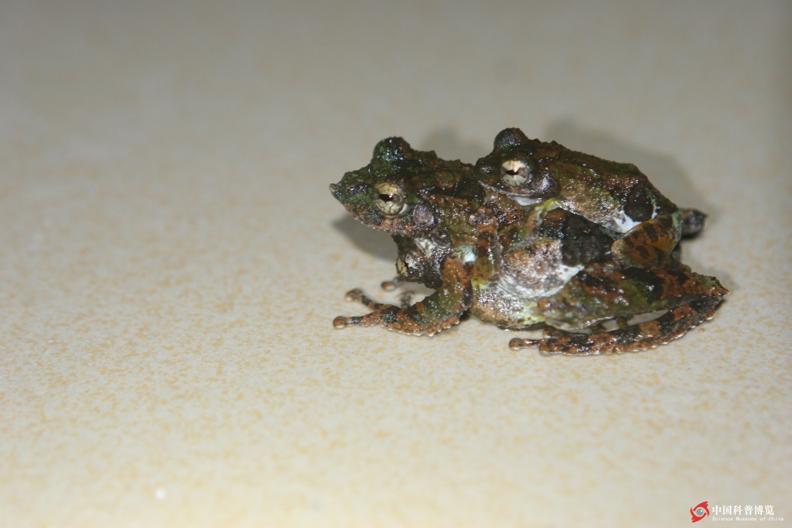 疊羅漢式”抱對,這種有趣的抱對方式在大樹蛙和無聲囊泛樹蛙上均有發(fā)生,場面有點(diǎn)凌亂。