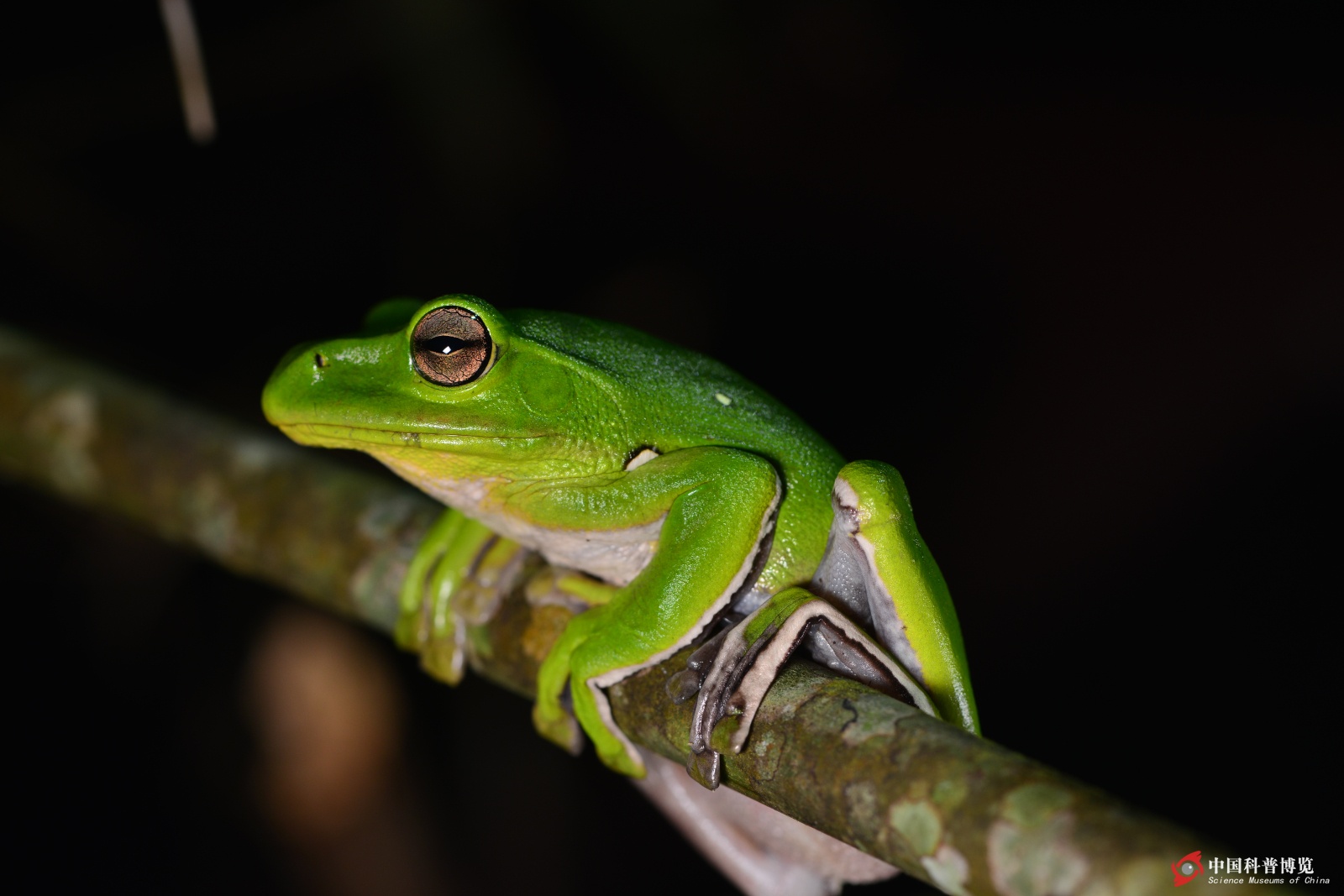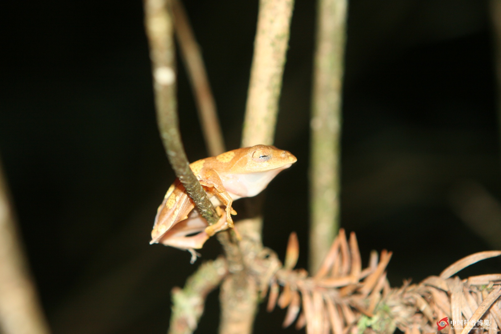 Rhacophorus?rhodopus眨眼的瞬間,身上的斑塊是由變異造成的
