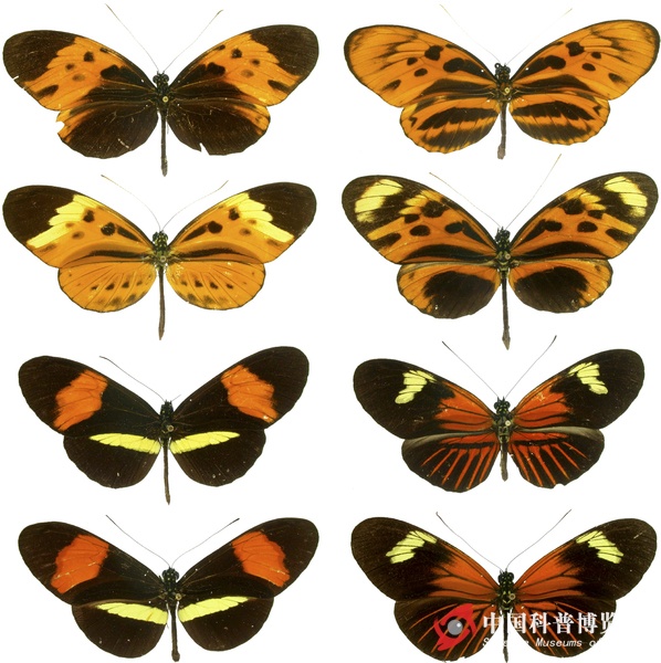 紅帶袖蝶(Heliconius melpomene)是袖蝶的一個(gè)種,在中南美不同的分布區(qū),這個(gè)種擁有30個(gè)左右翅膀上不同的圖案格局,而這些所有圖案又可以統(tǒng)一歸為兩類,一類是紅帶型(前翅有一個(gè)紅帶),另一類是放射型(前翅有橙色斑點(diǎn),后翅有放射狀橙色),我們可以簡單把它們稱之為紅色和橙色。此外,在同一區(qū)域還分布有另外三個(gè)物種青衫黃袖蝶(H. cydno)、白袖蝶(H. timareta)和富麗袖蝶(H. heurippa)。其中青衫黃袖蝶的擬態(tài)自成一派,翅膀條紋由黑色和黃色或白色組成,而白袖蝶和富麗袖蝶的圖案格局卻與和紅帶袖蝶類似。