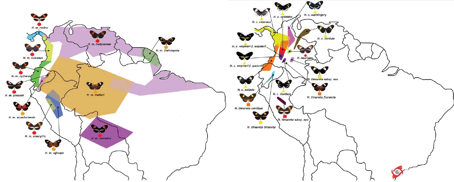 圖2 四種袖蝶的分布和翅膀圖案格局(左圖為紅帶袖蝶的分布,右圖為另外三種袖蝶的分布,顏色代表翅膀圖案類型,圖片來自Pardo-Diaz et al. 2012)