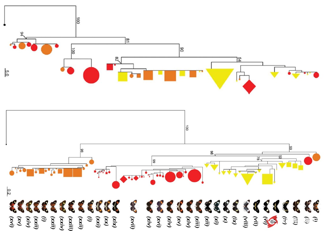 第一個(gè)可能就是它們是各自獨(dú)立起源的,也就是趨同或者平行進(jìn)化。但是,雖然趨同/平行進(jìn)化在自然界中也很常見,但不要忘了,紅帶袖蝶有上文提到的紅色和黃色兩大類圖案,在三個(gè)物種中兩大類表型上同時(shí)發(fā)生獨(dú)立起源,這樣的概率其實(shí)是非常低的。第二個(gè)可能是某個(gè)表型是祖先性狀,然后在進(jìn)化過程中發(fā)生了缺失,使有的支系個(gè)體改變了表型。然而,這幾種袖蝶的翅膀圖案格局和它們之間的系統(tǒng)發(fā)育關(guān)系并不一致,因此這樣的概率也很低。