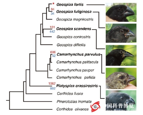 圖2 被選擇的達(dá)爾文雀和它們之間的進(jìn)化關(guān)系(圖片來(lái)自Skinner et al. 2014)