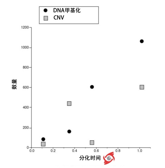 圖3 DNA甲基化和CNV隨物種分化時(shí)間的積累(圖片來(lái)自Skinner et al. 2014)
