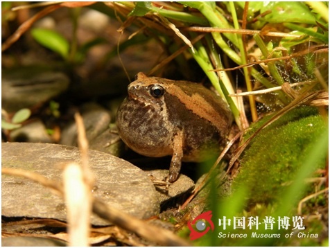 圖1. 示飾紋姬蛙的聲囊,鼓起的聲囊呈灰棕色