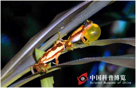 聲囊通過降低體腔與環(huán)境的阻抗失調使聲音能量損失達到最少,增加鳴叫率并使聲音朝大范圍角度傳播,這是聲囊的聲音信號功能。然而當時科學家并沒有認識到不斷伸縮的聲囊也是一種重要的視覺信號。