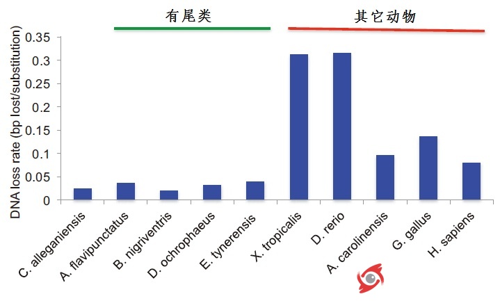同時,他們也發(fā)現(xiàn)隱鰓鯢基因組小插入缺失的丟失率也比其它動物要低,這也可能是促進有尾類基因組擴張的一個原因。