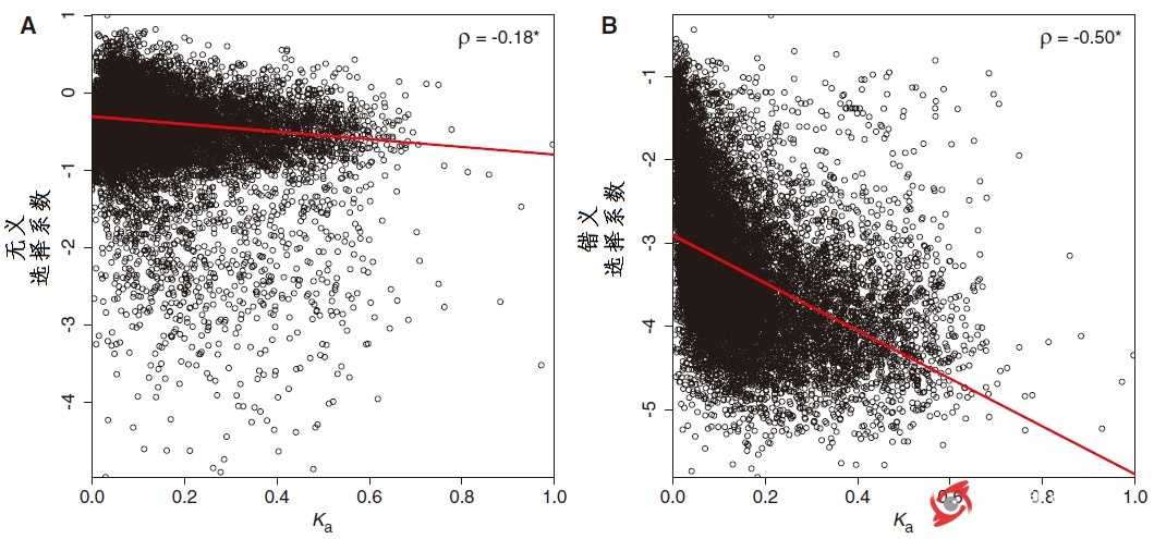 科學(xué)家分析了162個(gè)果蠅家系的13182個(gè)蛋白編碼基因的進(jìn)化,結(jié)果一共發(fā)現(xiàn)了1548個(gè)無義突變和181192個(gè)錯(cuò)義突變。并未出乎意料的是,無義突變的選擇系數(shù)要遠(yuǎn)大于錯(cuò)義突變,也就是說丟失功能比改變結(jié)構(gòu)對(duì)個(gè)體本身的危害更大。但是,當(dāng)與非同義替代率相比較,卻發(fā)現(xiàn)Ka與錯(cuò)義突變的選擇系數(shù)密切相關(guān),其相關(guān)系數(shù)達(dá)到Ka與無義突變的3倍。進(jìn)一步檢查了這兩種突變與一些功能的關(guān)系,發(fā)現(xiàn)錯(cuò)義突變所受的選擇壓力與無論基因表達(dá)水平、基因表達(dá)特異性還是蛋白質(zhì)相互作用程度都呈現(xiàn)更強(qiáng)的相關(guān)關(guān)系。