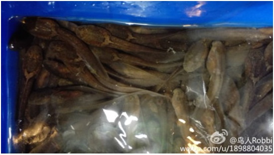 圖1.藍色箱子里裝的就是出售的峨眉髭蟾蝌蚪(圖片來自新浪微博@鳥人Robbi)