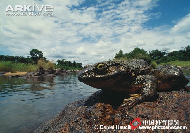 科學(xué)界比較公認(rèn)世界上最大的蛙類是西非喀麥隆的巨諧蛙(goliath frog;Conraua goliath),又叫非洲巨蛙。巨諧蛙體型肥碩巨大,腿部異常發(fā)達(dá)健壯。體長(zhǎng)約17-40厘米,通常有30厘米長(zhǎng)左右,體重可達(dá)3.3 千克。頭部寬而平扁,皮膚光滑,后腿非常強(qiáng)健,足部蹼發(fā)達(dá),非常善於游泳。體表藍(lán)灰色到綠色,帶有褐色斑紋。雄蛙較雌蛙大,且有較大的鼓膜。它們很害羞,受干擾時(shí)馬上潛入水中,不易捕獲。它們大多分布在喀麥隆及赤道幾內(nèi)亞,海拔1000米以下的地區(qū)。巨諧蛙是水棲性的蛙,通常生活在茂密雨林中的清澈的湍流里面,或聚集在瀑布下面,很少離開(kāi)水域。巨諧蛙屬于兇猛的食肉動(dòng)物,在水中所到之處能捕到的都會(huì)成為它飽餐的對(duì)象,如昆蟲、蝦、魚和小型的蛙類等。
