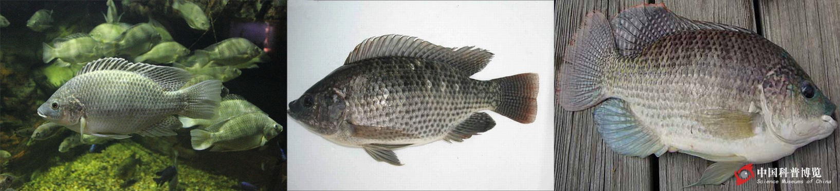 圖1. 三種羅非魚:依次為莫桑比克羅非魚,尼羅羅非魚和奧利亞羅非魚