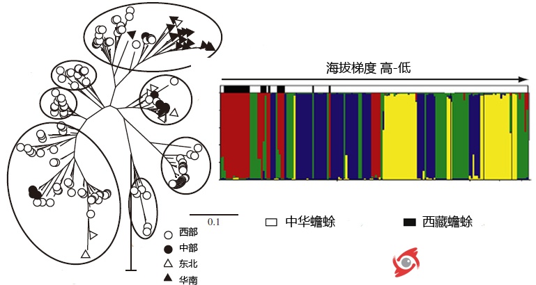 圖3. 進化關系重建和個體聚類均表明西藏蟾蜍和中華蟾蜍沒有明顯區(qū)分