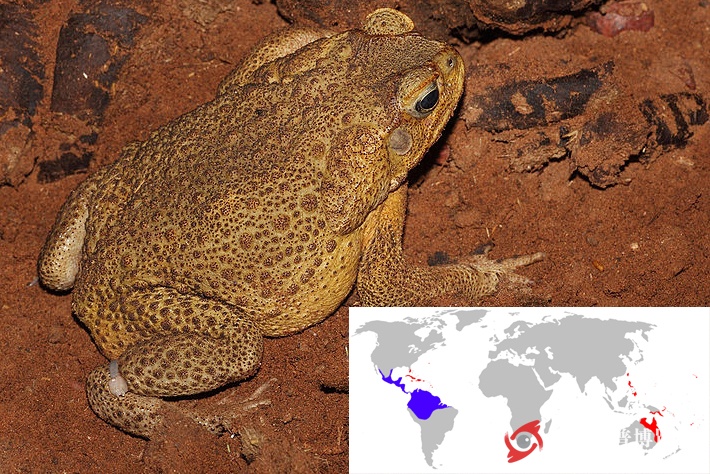 圖1. 海蟾蜍及其分布范圍(藍色為原棲息地,紅色如人為引入棲息地)