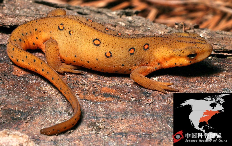 Notophthalmus viridescens)是一種很早就被發(fā)現(xiàn)有斷肢再生能力的蠑螈,它們廣泛分布在北美大陸東部的亞熱帶和溫帶地區(qū),并且成為了科學(xué)家們探索蠑螈斷肢再生之謎的一個重要研究對象。