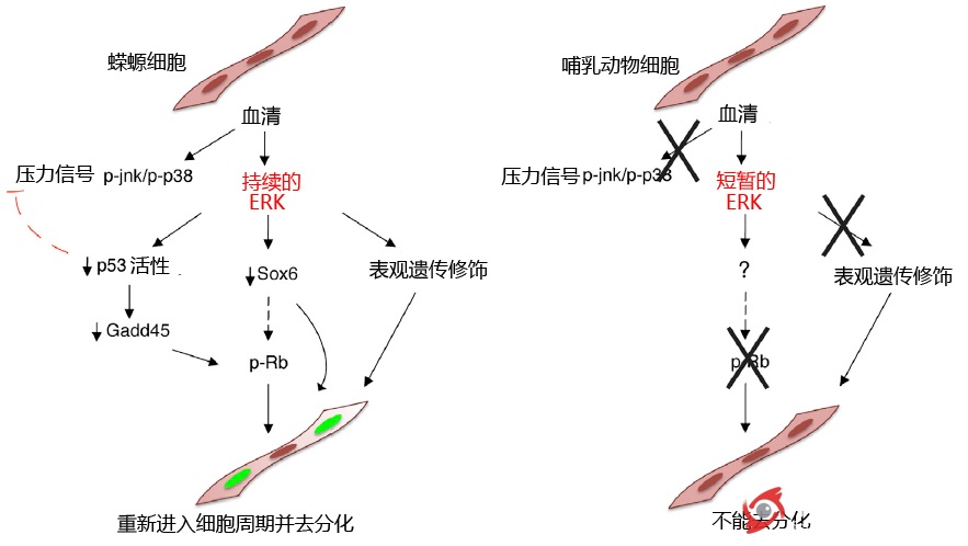 圖2. ERK相關(guān)的重編程反應(yīng)在蠑螈和哺乳動物細(xì)胞中的區(qū)別(圖片來自參考資料2)