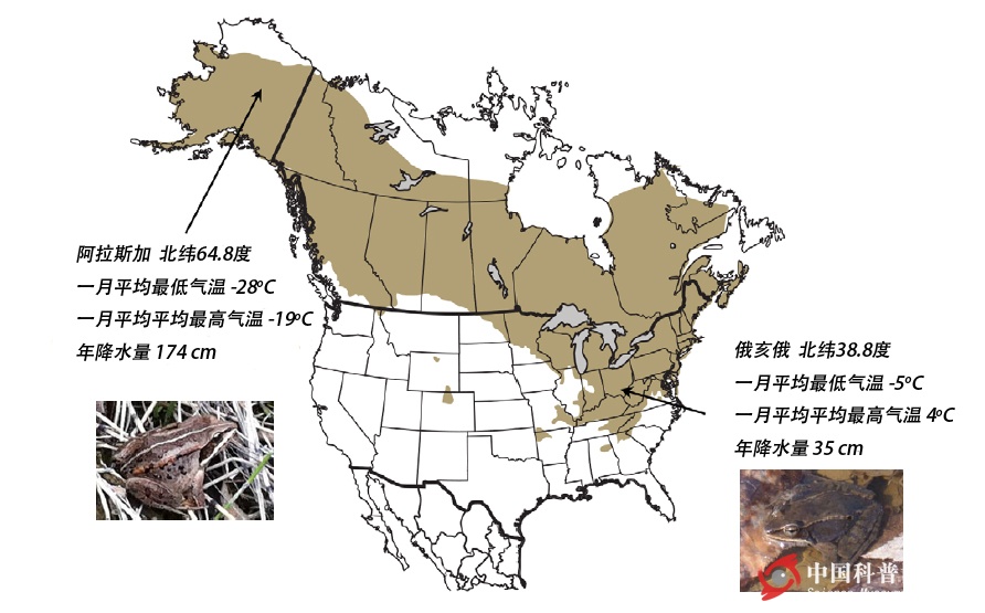 Rana sylvatica)就是一種可以在北極圈內(nèi)生活的蛙類。嚴格地說,美洲林蛙廣泛地分布在北美大陸上,從亞熱帶的美國佐治亞州到嚴寒的阿拉斯加,都可以見到它們的倩影。生活在極地的美洲林蛙只是它們中的一小部分,然而就是這一小部分林蛙上演了屬于兩棲動物的抗寒奇跡。