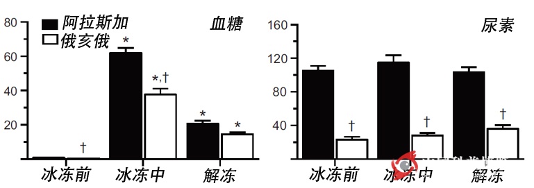 進一步對美洲林蛙進行生理檢測,科學(xué)家發(fā)現(xiàn)極地林蛙體內(nèi)的一些物質(zhì)的積累,可能有助于抗寒,這其中包括了血糖、尿素和一種未知的溶質(zhì)。對大多數(shù)動物來說,長期處于零下嚴寒的溫度下,由于組織液結(jié)冰的緣故,會使得細胞逐漸收縮脫水,最終導(dǎo)致細胞死亡。而對于極地林蛙,由于血糖和尿素等溶質(zhì)濃度的升高,會降低體內(nèi)組織液的凝固點,限制了體內(nèi)組織液結(jié)冰的數(shù)量,最終達到保護的目的。此外,一種未知溶質(zhì)被發(fā)現(xiàn)在極地林蛙中含量增加,這種物質(zhì)可能也與抗寒能力相關(guān),盡管它的性質(zhì)還沒有被鑒定,但已經(jīng)被作為了將來的研究方向。