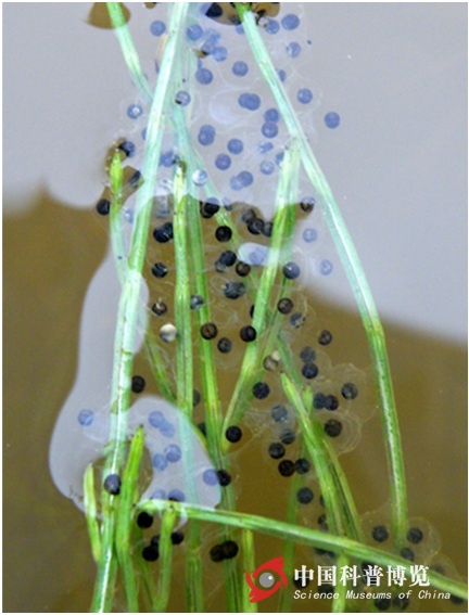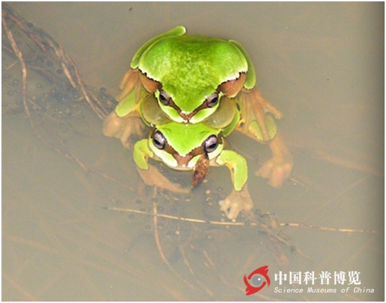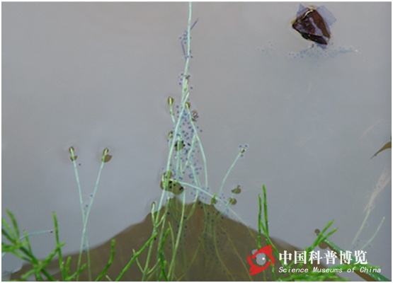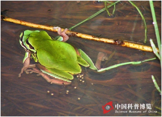 雄蛙眼神迷離地伏在雌蛙身上,腹部緊貼雌蛙背部,并有節(jié)律地鼓動,大約兩秒一次。這是在調(diào)整雌蛙體內(nèi)的激素節(jié)律。這個(gè)節(jié)拍是要讓雌蛙的排卵與雄蛙的受精同步。嗒,嗒,嗒,嗒??雄蛙不斷地給節(jié)奏,雌蛙從一個(gè)草桿上,移動到另一個(gè)草桿上,似乎對雄蛙的指令若無其事。突然,雌蛙頭部昂起,腰部下陷,打開的雙腿之間排出一串卵粒;同時(shí),雄蛙用雙腿夾打雌蛙兩側(cè)腹部,這應(yīng)該是雄蛙排精的時(shí)候。動作持續(xù)10秒左右,雌蛙反彈回正常姿勢,掛在草桿上的卵條,隨著雌蛙的移動,從生殖孔上脫落。雄蛙繼續(xù)用腹部給節(jié)奏,醞釀下一次排卵授精。