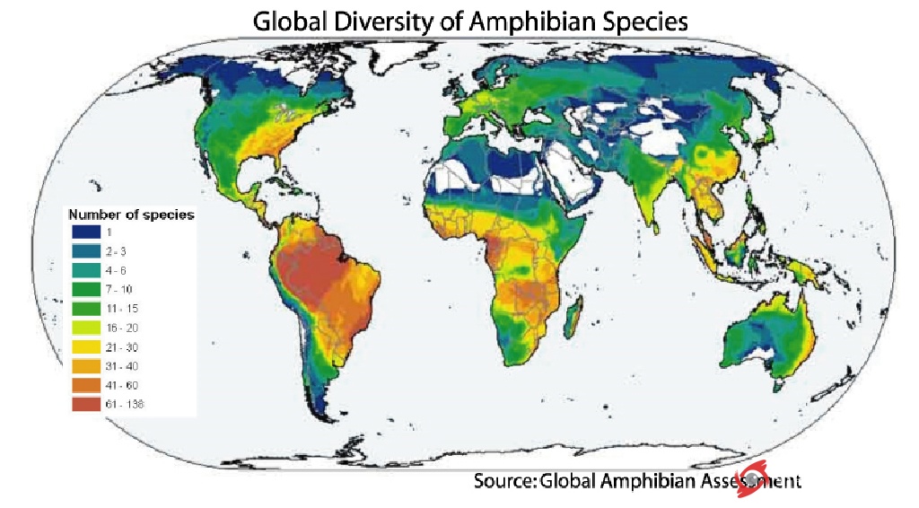 圖一:世界兩棲動(dòng)物物種豐富度圖(顏色越紅表示這個(gè)地區(qū)兩棲動(dòng)物種類越多,顏色越藍(lán)表示這個(gè)地區(qū)兩棲動(dòng)物種類越少)