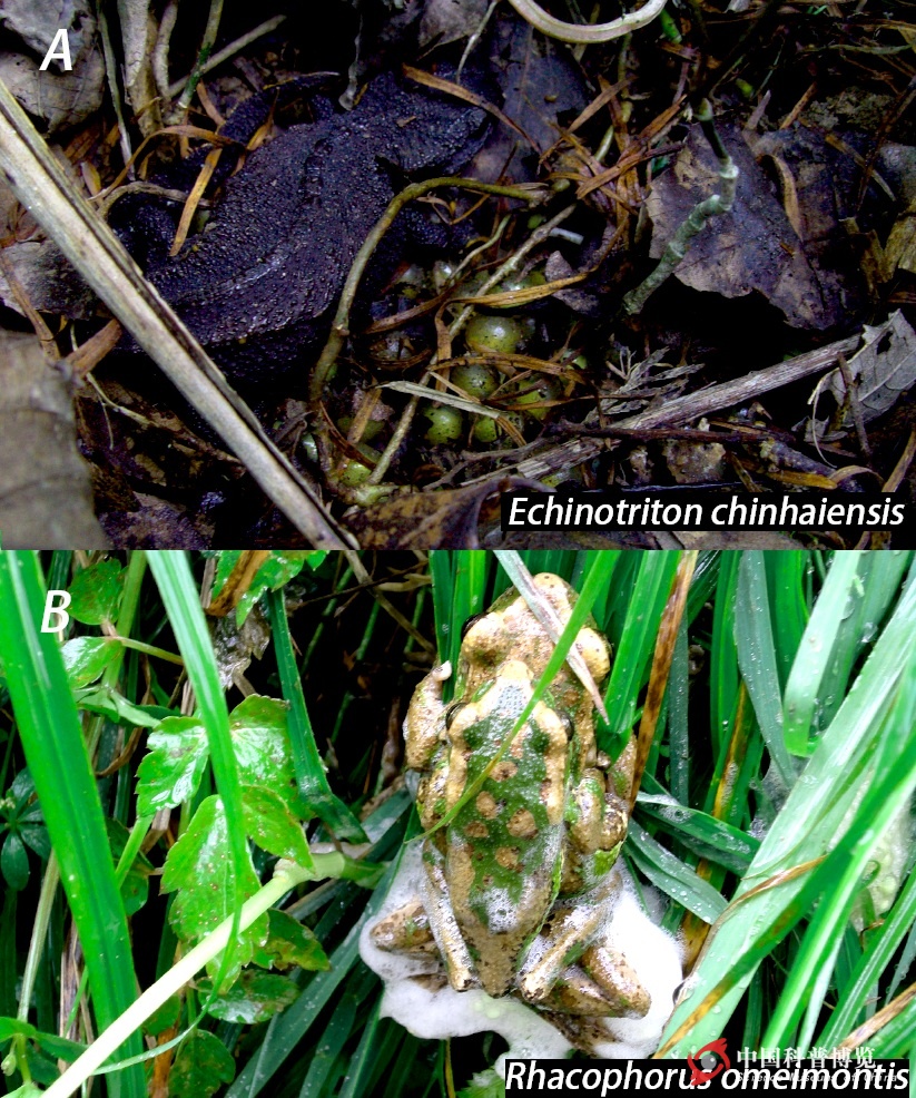 (圖A鎮(zhèn)海棘螈由謝鋒拍攝;圖B峨眉樹蛙由蔡波拍攝)