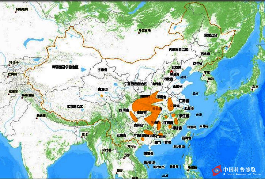 圖2 大鯢的地理分布圖(黃色區(qū)域為主要分布地, 圖片來自IUCN)