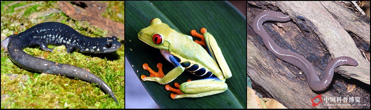 兩棲類三個(gè)大類群的物種:有尾目、無(wú)尾目和無(wú)足目(圖片出處見(jiàn)文末)