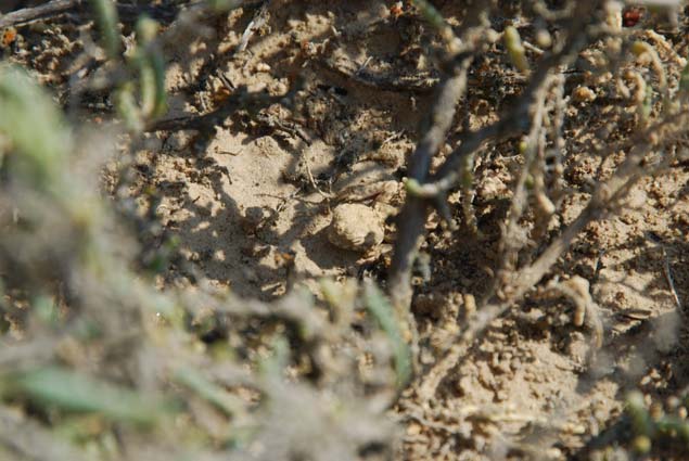 圖中央的圓球就是躲在灌叢中旱地沙蜥的腦袋(蔡波拍攝)"]