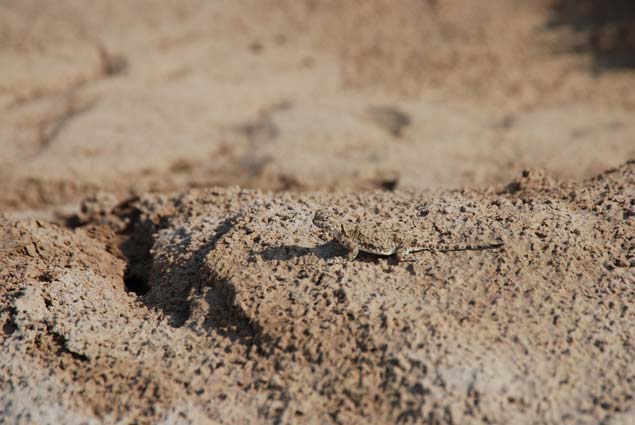 我們要找的另一種奇特荒漠蜥蜴就在這里,它是旱地沙蜥。旱地沙蜥在中亞都有分布,但這里的和其他地方的不同,它們脖子上有紅點,而且只分布在鹽湖區(qū)域,沒有在周圍的草原沙漠中出現(xiàn)。它們很善于偽裝,除了和鹽泥相同的顏色之外,它們遇到敵人時還會緊貼地面,將體色和環(huán)境融為一體,讓人極難察覺。