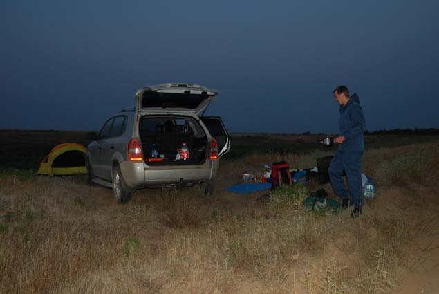 臨近晚上,我們在湖邊找了一個淡水洼露營,晚餐就邊喝著伏特加邊講著各種故事。丹尼爾前一秒還在煞有介事地在手電照耀下做筆記,卻忽然跳了起來,然后又很興奮,到處找瓶子。原來他發(fā)現(xiàn)防潮墊旁邊有一只毒蜘蛛,抓起來打算給他研究蜘蛛的朋友。